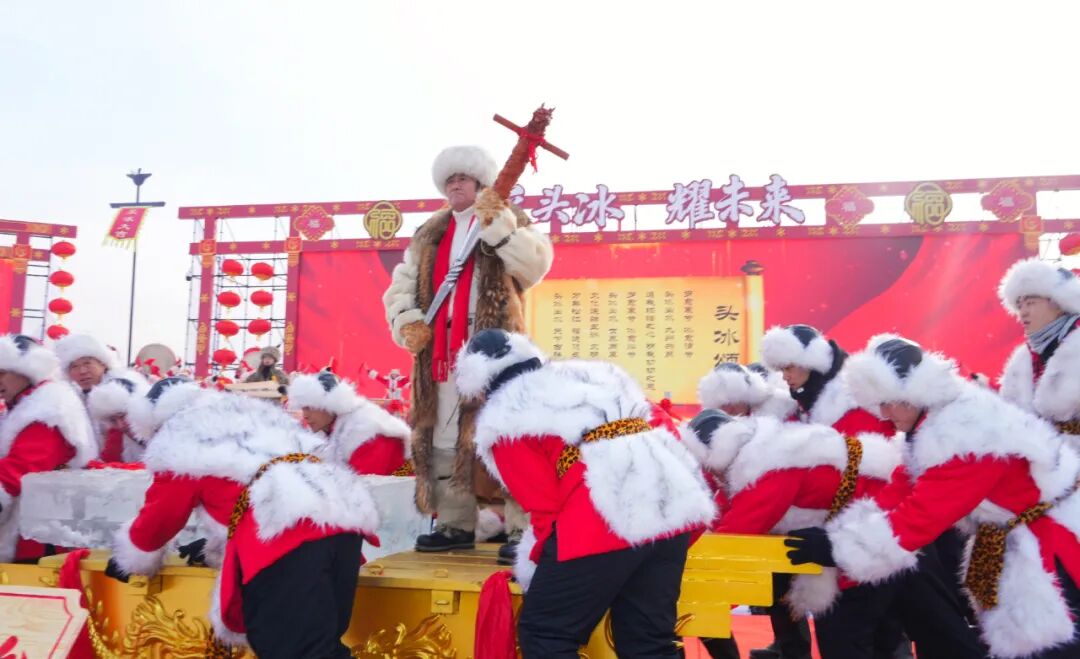 亮点二:创新舞台设计。今年,增加舞台高度,提升神圣感和仪式感,周围辅以大规模的中华传统文化符号——旗阵和鼓阵,增强视觉冲击力。同时,在集市区设置聚宝盆景观雪雕,通过向市民和游客发放福袋将此处打造成打卡点。在传统采冰仪式结束后的互动活动中,加入“领福袋 接福气”环节和“滚冰祈平安”环节,展现地方人文文化与冰雪旅游活动相互交融的独特魅力。