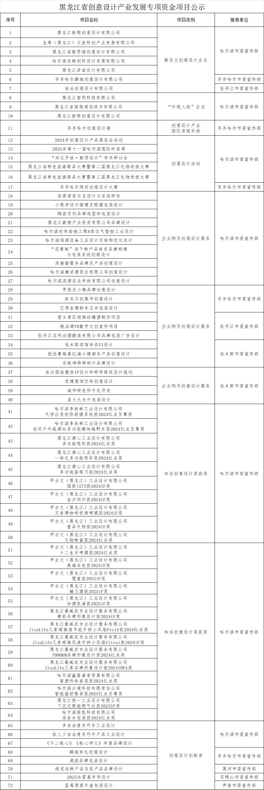 根据《黑龙江省支持创意设计产业发展若干政策措施》 《黑龙江省创意设计产业发展专项资金管理办法》《黑龙江省支持创意设计产业发展政策措施操作规程》要求,经申报受理、材料审核、联合评审,现将通过评审的项目予以公示(名单详见附件)。