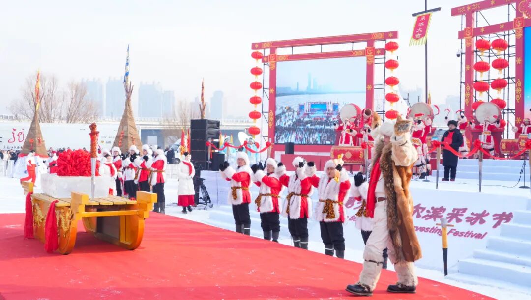 亮点二:创新舞台设计。今年,增加舞台高度,提升神圣感和仪式感,周围辅以大规模的中华传统文化符号——旗阵和鼓阵,增强视觉冲击力。同时,在集市区设置聚宝盆景观雪雕,通过向市民和游客发放福袋将此处打造成打卡点。在传统采冰仪式结束后的互动活动中,加入“领福袋 接福气”环节和“滚冰祈平安”环节,展现地方人文文化与冰雪旅游活动相互交融的独特魅力。